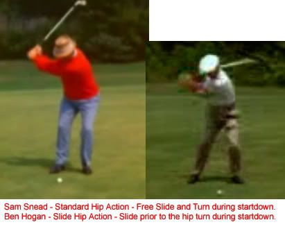However when using standard hip action on the downstroke where the hip slide and turn are more mixed (again for lack of a better word), you do get that 'sit down look' (think Snead) . Infact you get very much during the startdown what you had at address....And with the standard hip action the left leg will slightly decrease its bend from the top during startdown....