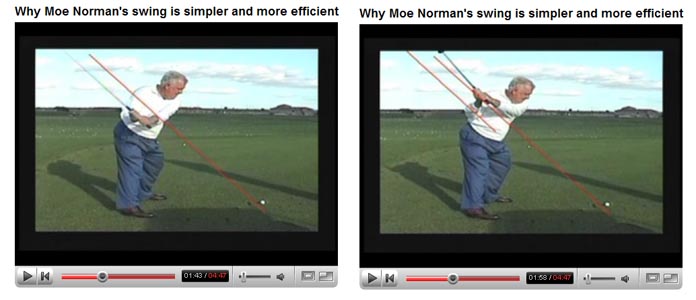 It looks like Moe Norman is on shallower, but parallel, plane in mid-backswing. However, I now realize that my interpretation of a plane shift was wrong and that it was due to camera angle distortion-error. I only realized that Moe Norman really stayed on the same plane when I had the opportunity to analyse a swing video from an up-the-line (rather than down-the-line) swing video where there was far less camera angle parallax error problems. I then realized that Moe Norman really had a zero-plane shift swing.
